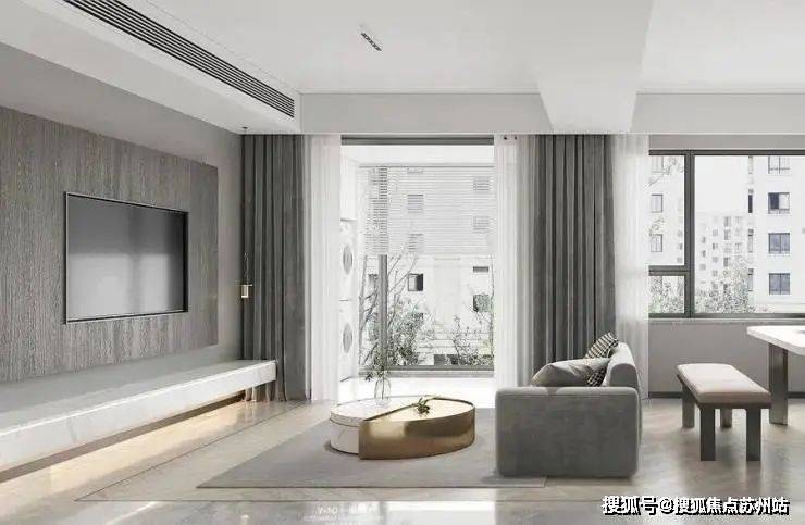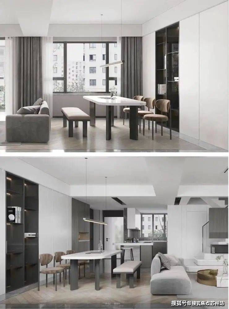 客餐厅一体化,让空间更加通透大气,水吧顶面设计出风口,空间更有现代感
