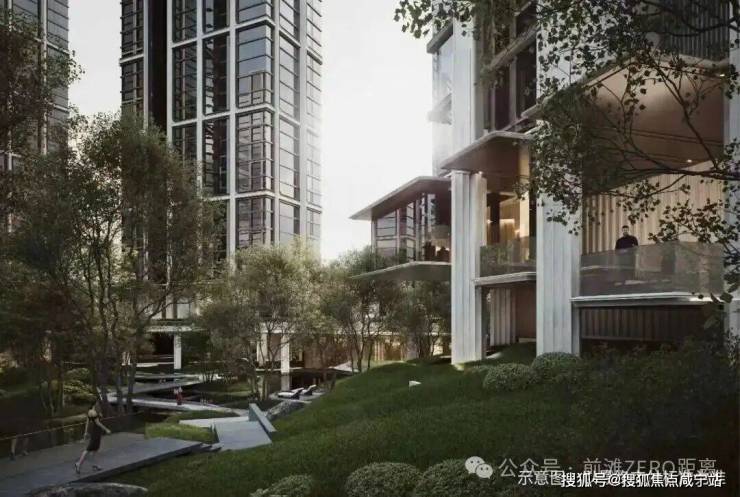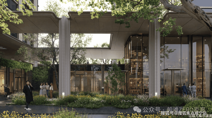 穿过园林,上海最大的约3500㎡下沉水院构成社区的核心灵魂,约13米的高差形成独特的“峡谷绿洲”,将黄浦江的水意象引入社区,中央平静水面与四周的会客舱、茶室、游泳馆形成呼应。