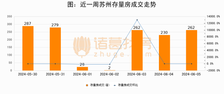 从存量房来看,2024年06月05日苏州存量房单日成交262套,比昨日增加32套,环比上涨13.9%。从近一周存量房成交来看,苏州存量房日均成交套数为192套,06月05日单日成交262套,高于近一周平均水平36.5%。