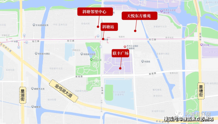 背依斜塘老街时尚街区,紧邻邻里中心,向东约1km(一站地铁)奥体中心,向西约1.5km邻瑞广场山姆超市、向北约2.5km圆融时代广场、久光百货、IFS苏州国际金融中心。沿中新大道与金鸡湖隧道直达苏州中心。