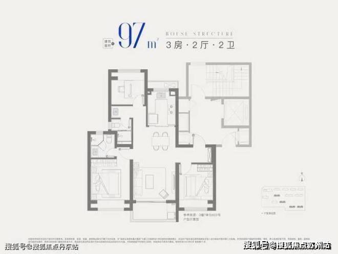 T2 房型:97㎡三房两卫 (户型方正南北通透,3 开间朝南,拥有观景阳台,采光面充足)