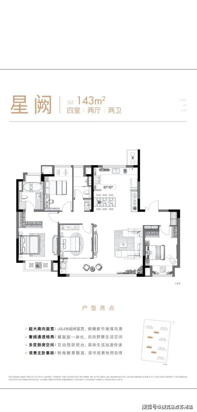 主力户型:有 99㎡、119㎡三居室及 144㎡四居室,设计采用四开间朝南、南北双阳台,空间布局合理,采光通风良好。