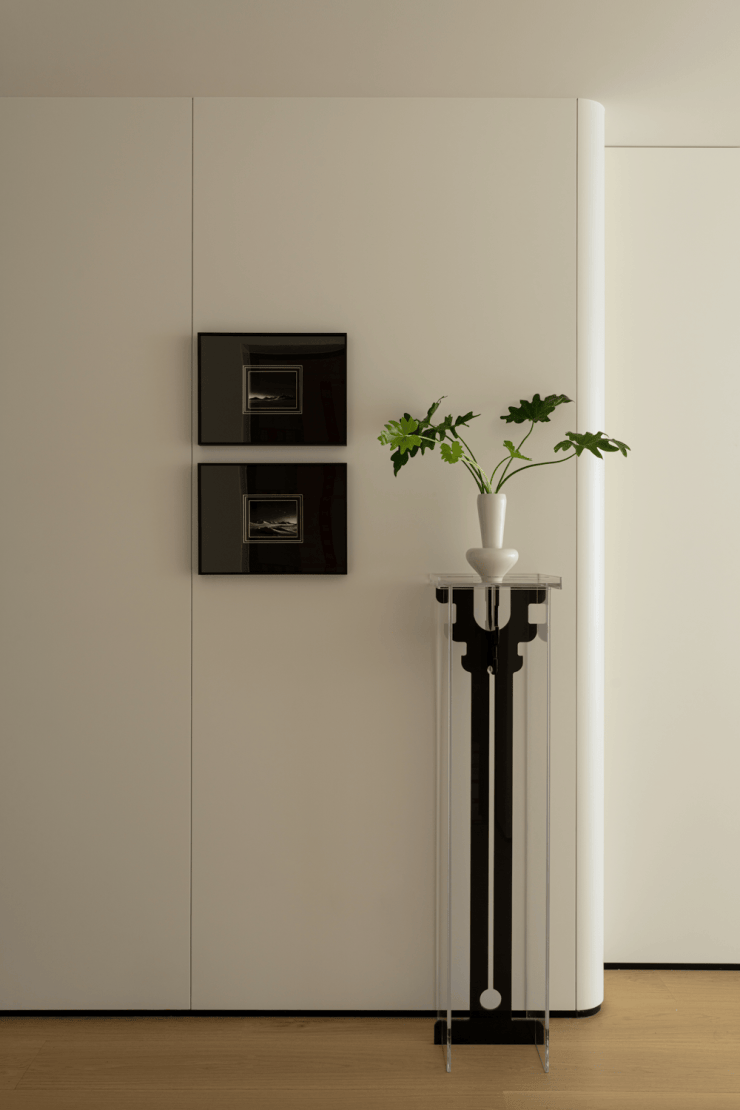 作为入户第一幕,玄关以极简姿态开启生活叙事,素净墙面如天然画布.清透支架托举着素白花瓶,植物姿态俏皮延展,成为连接户外与生活的温柔过渡.