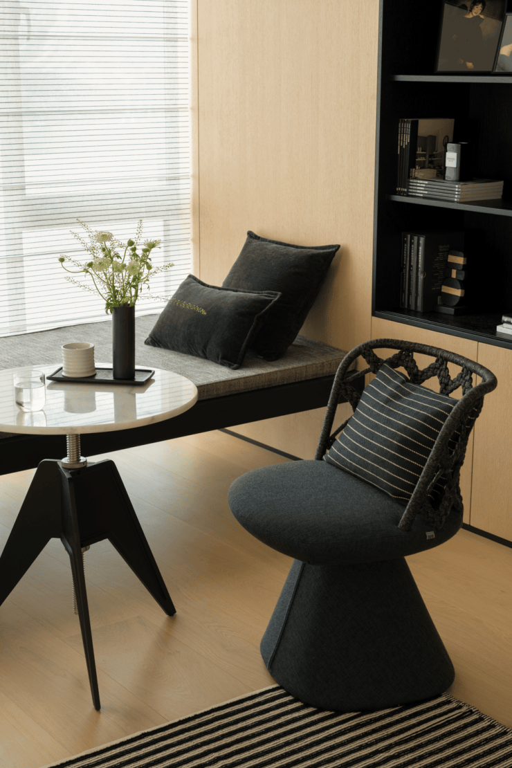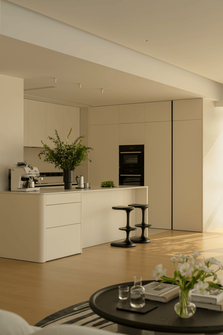 全开放式设计,岛形沙发打破边界,让交流随光影自由发生.午后的光线从侧面洒落,家具被赋予立体的光影层次.