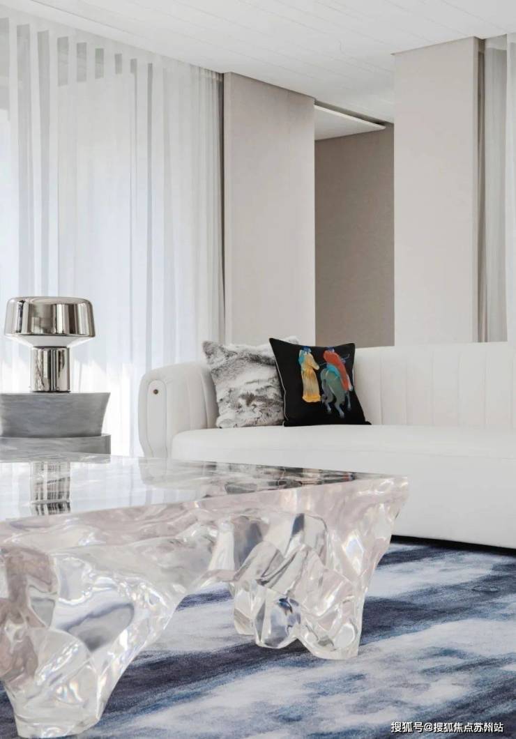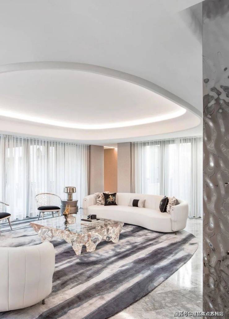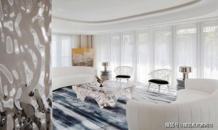 瀑布灯、云形的天花、游船般的沙发,如水漫出的茶几与不锈钢波纹板、还有梦云椅。线条灵动自然,波光粼粼。