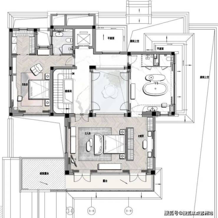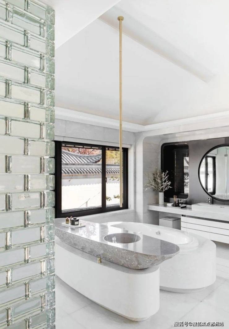 主卧利用坡屋顶使其具有高挑的空间感,主浴室延续“水”的符号,呼应“苏州气韵”。