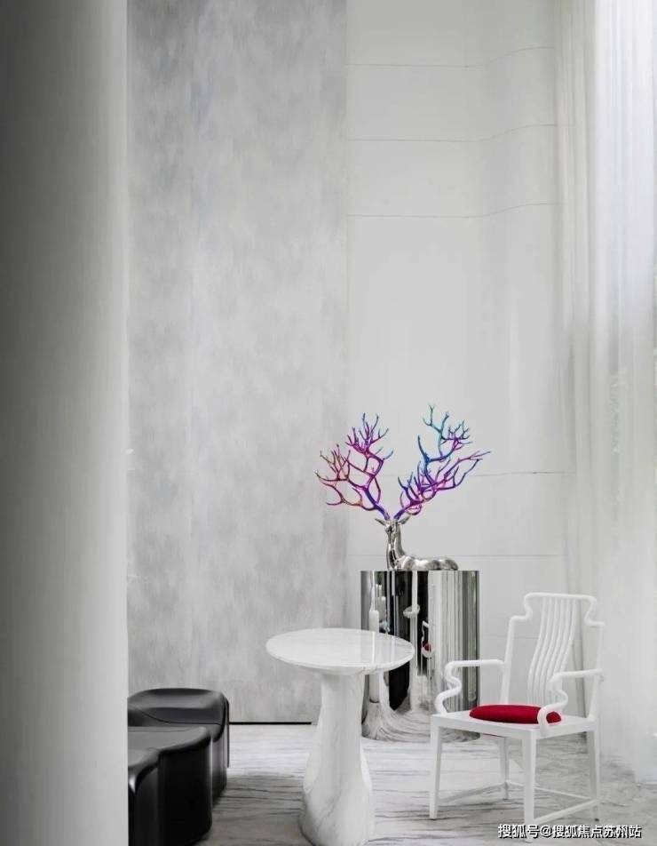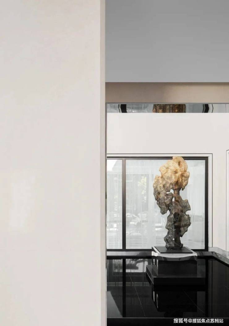玄关处,邱德光设计联合艺术家刘峰打造一尊镂空的太湖石雕塑《墨金》,为整座宅邸的精神重心。