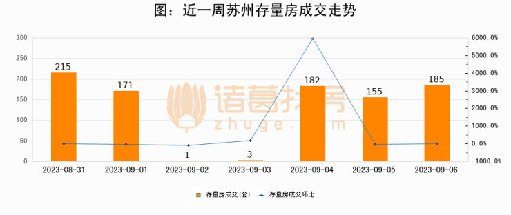 从存量房来看,2023年09月06日苏州存量房单日成交185套,比昨日增加30套,环比上涨19.4%。从近一周存量房成交来看,苏州存量房日均成交套数为130套,09月06日单日成交185套,高于近一周平均水平42.3%。