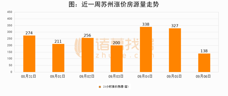 根据诸葛找房数据显示,苏州24小时涨价房源量为138套,较09月05日减少189套,环比下降57.8%。与此同时,涨价房源占比小幅回落,对于购房者来说是一个入市窗口期,购房者可抓住时机入市。