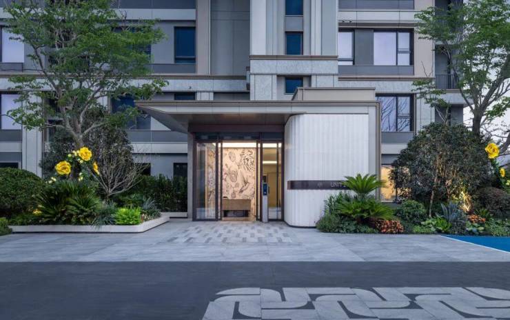 精装单元入户 ,大气的入户大门、定制地毯式铺装、两侧点缀景树,是归家仪式感的体现,更是花园归家的品质体验。