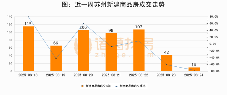 根据苏州市房地产市场和交易管理中心数据显示,2025年08月24日苏州新建商品房成交10套,较昨日减少32套,环比下降76.2%