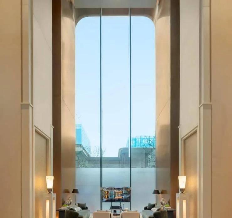 巨型超白玻璃墙,与下沉庭院风景无届链 接,让会所融入叠瀑翠谷之中,而这种巨幅超白玻,采用的是苹果旗舰店同款。