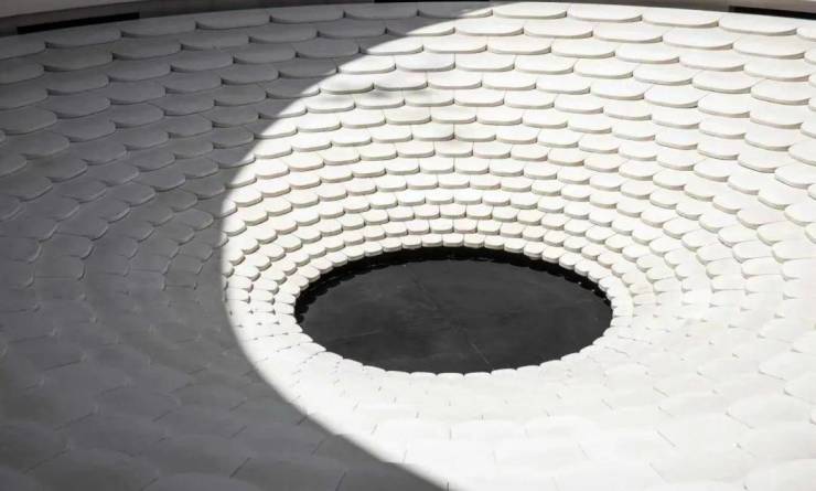 浮光池院水院会客厅,现已实景呈现,水景中央的艺术小品,如一滴水在湖面晕开,泛起阵阵涟漪。