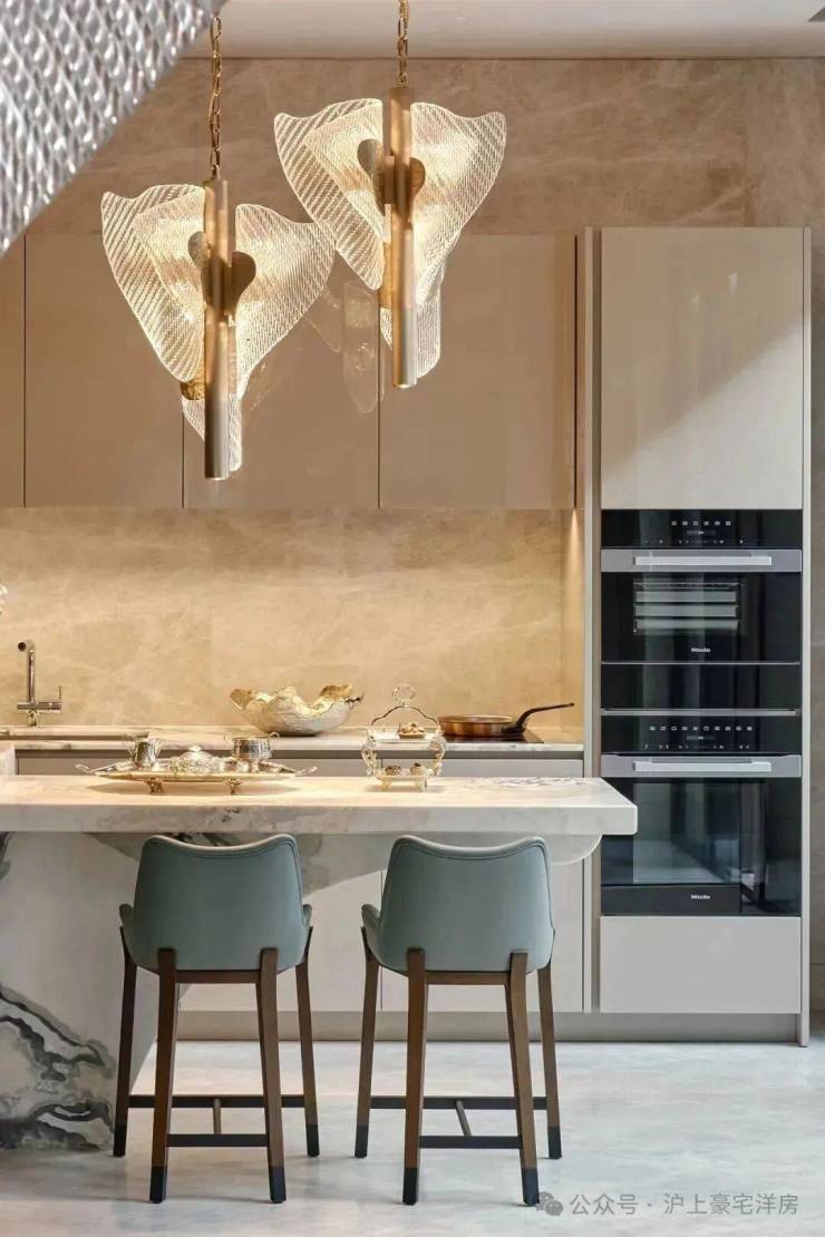 开放式布局消弭功能边界,大理石的冷冽肌理与皮革温润形成理性对话,金属线条勾勒出老城厢砖瓦的抽象轮廓,完成一场跨越时空的材质碰撞。