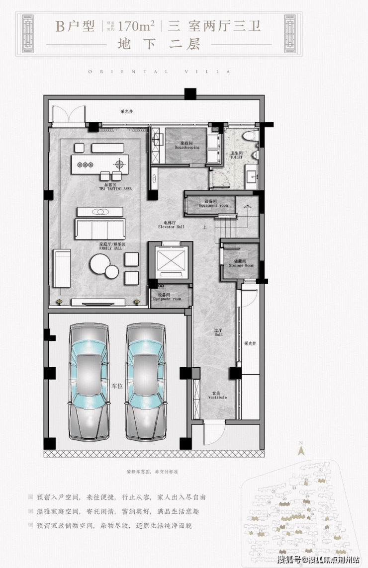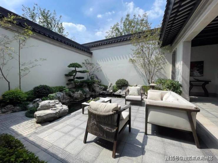 以春江御园建面约170㎡中式合院为例,南入的这处庭院位于前庭,回到家第一眼便是小桥流水,同时南北三庭院的配置,在家中即可实现移步换景.一楼餐客厅分离式布局,娱乐就餐两不误;老人房朝南设计不仅踏实接地气,还能直面小院品味多彩时光.
