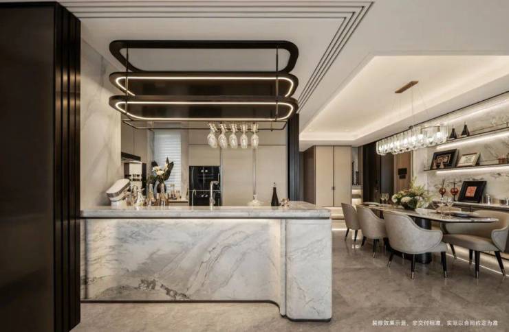 为一块奢石弧形工艺,投入翻倍的成本,整屋坚持用一种昂贵的木饰面贯通始终,从而实现整体艺术风格的统一。