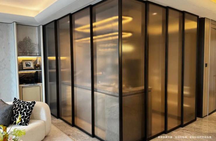 厨房与餐厅打造半开放式格局,隐形推拉门既可以隔绝烟火,平时收入墙内让空间一体、开阔大气。