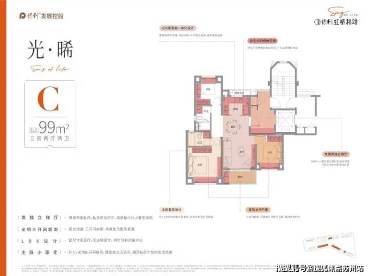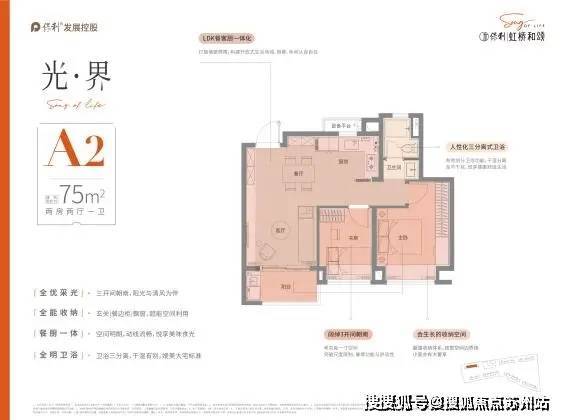 户型设计上,保利虹桥和颂,品质改善为出发点,设计“私属、至臻、尊崇”三大产品理念, 臻奢建面约75㎡户型,三开间朝南,阳光与清风为伴,玄关+餐边柜+飘窗,全能收纳,卫浴三分离,干湿有别,奢阔餐客厅一体,空间明朗,动线流畅。上海保利虹桥和颂售楼处电话 400-8787-554