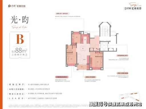 臻奢建面约88㎡/99㎡户型,专属定制类独立梯厅,让生活拥抱私密和尊崇,LDK餐客厨一体化设计,动线流畅,链接多元生活场景,南北通透三开间朝南设计,承载生活更多浪漫。