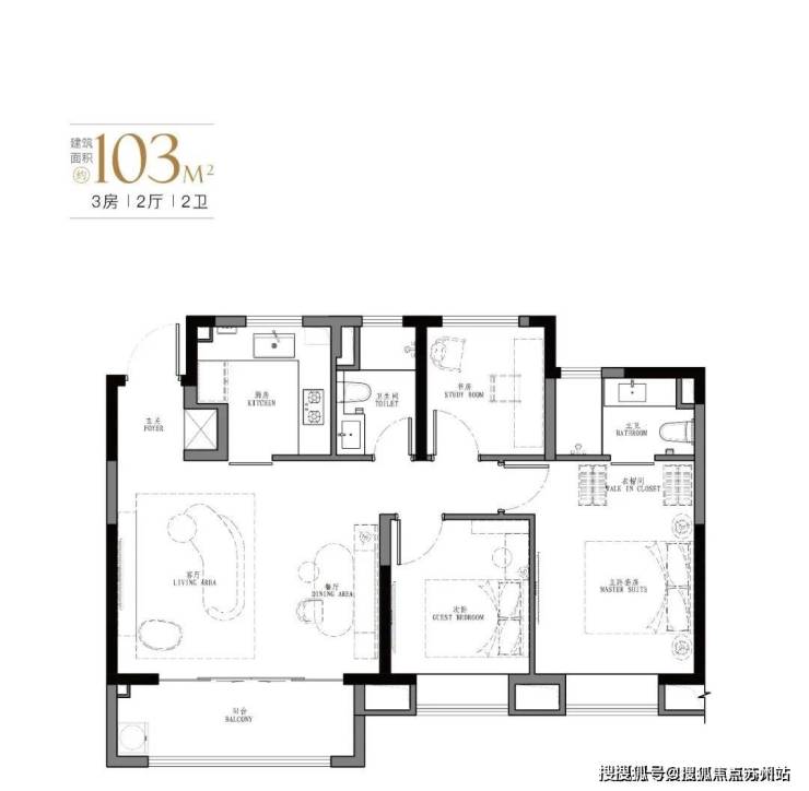 产品:103㎡、107㎡的三房两厅两卫及123㎡、129㎡的四房两厅两卫