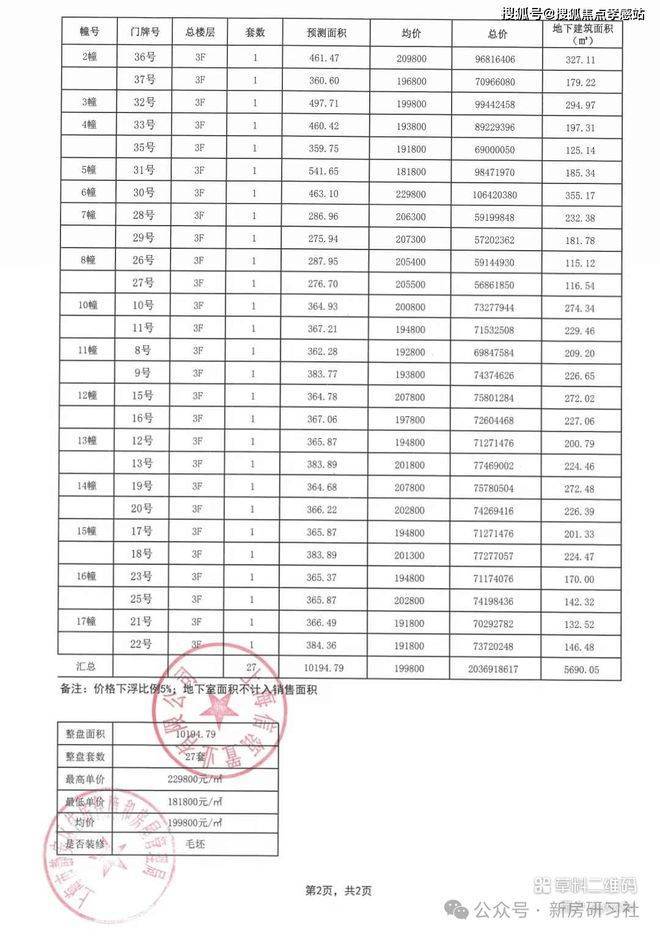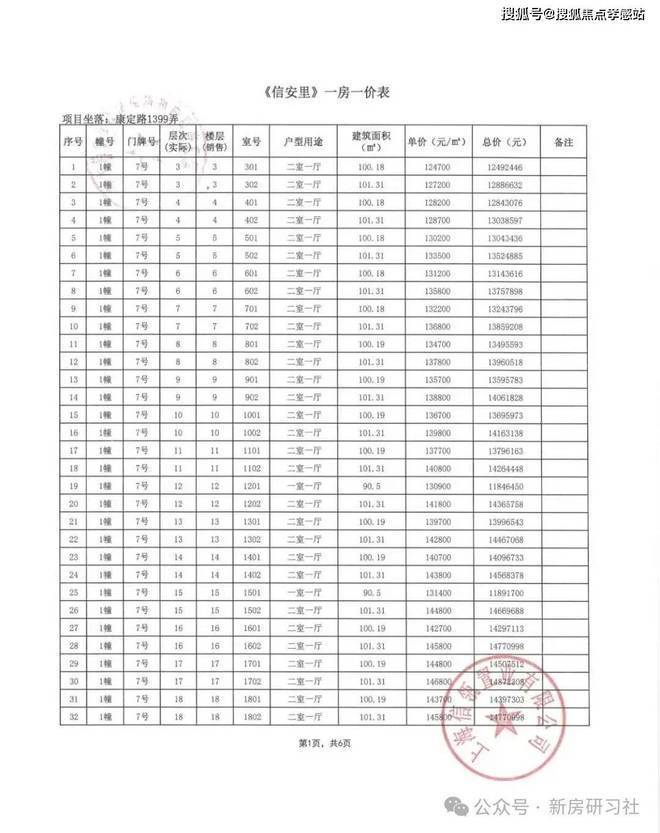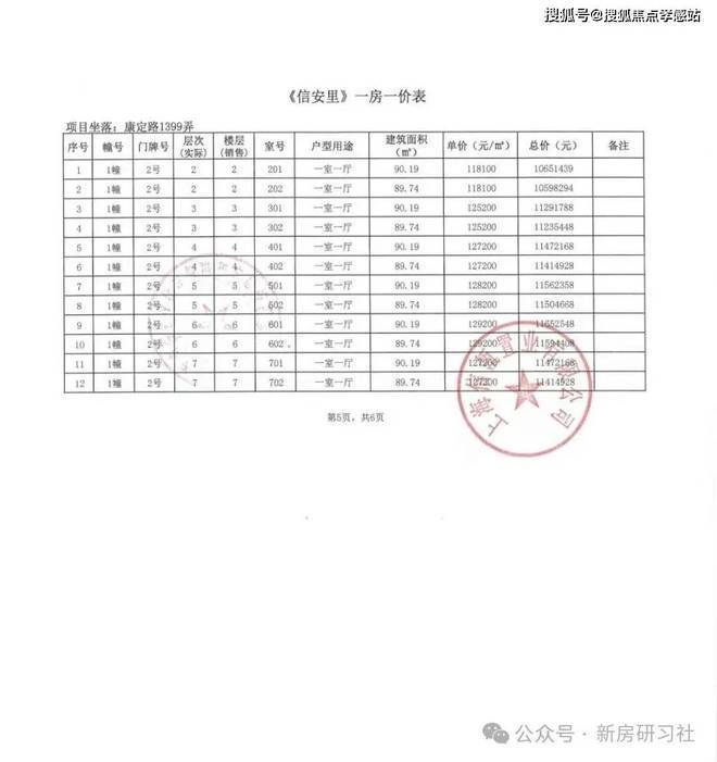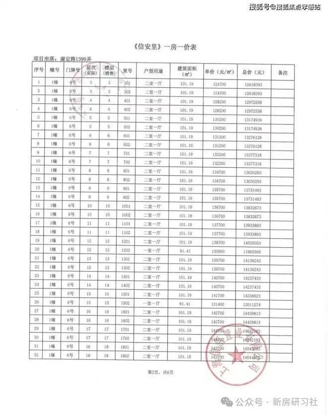 高层/别墅 一房一价表如下: