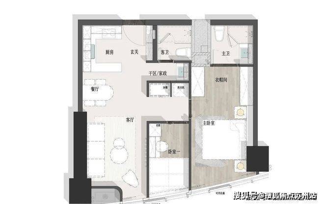 客厅空间舒适,电视背景面完整,可设置闭合式移门,拓展客厅空间的多用性;