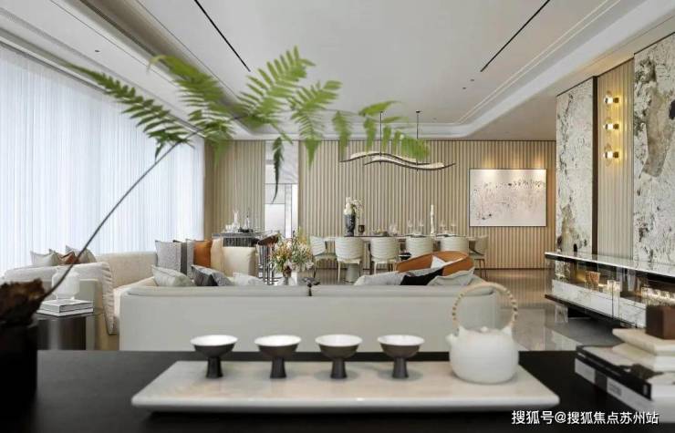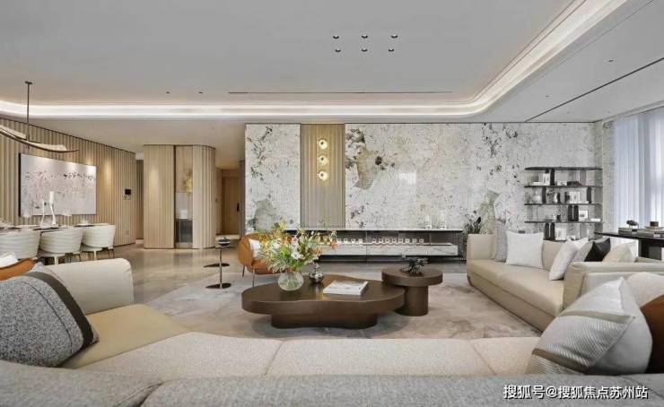 东区建面约320户型,将艺术感进一步融入日常中。特别设计的专属门厅空间,是从电梯厅延伸到家,如同一处艺廊,放慢人的情绪;室内选用了浅金色奢石(外界也称其为“芬迪白大理石”)作为主要的石材,曲面的木饰面也为浅色,整体给人以明亮感。