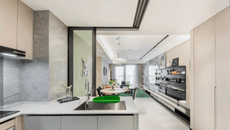如果在家聚餐,厨房水槽这侧还能作为“小岛台”使用,餐桌上摆不下的,可以随手放在岛台上,还不用跑进跑出,简直太人性化了!