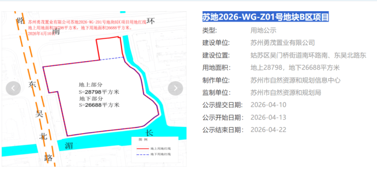 从拿地到出规划,仅用1天的南门1号地块又有新动作了!苏地2026-WG-Z01号地块B区项目用地公示了!根据公示,项目地上28798,地下26688平方米!