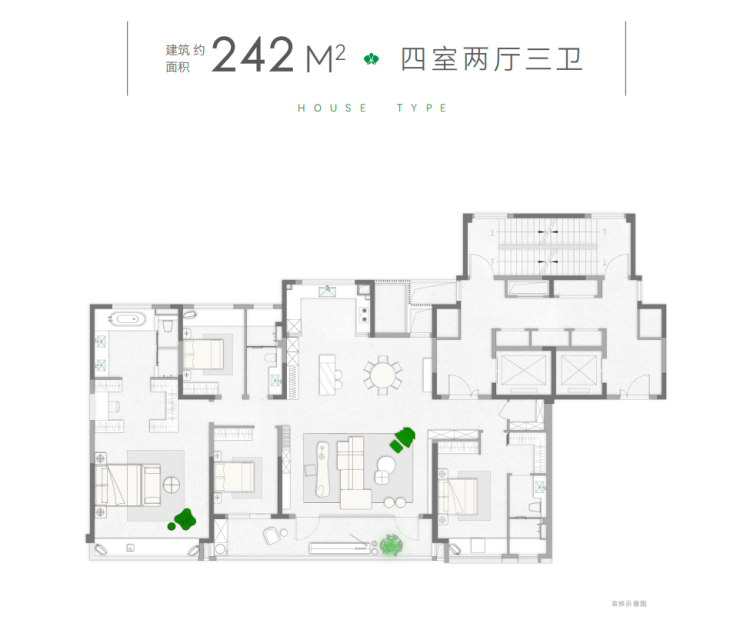 建面约242㎡四房: 这才是真正的大宅风范!面宽约20.7米,拥有两个朝南的豪华主卧套房。约80㎡的餐客厅大得惊人,就算做了中西双厨,摆下大圆桌也绰绰有余,家族宴请、朋友聚会气场十足。
