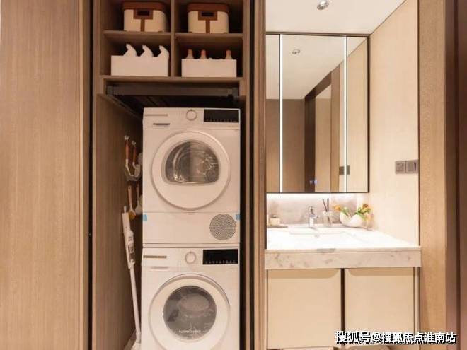 它整合了洗烘套件、分类收纳,将洗衣、烘干、收纳整理集中于一体.另外据说后期开发商可提供阳台改造隐形晾衣架服务,供业主自主选择烘干或晾晒.