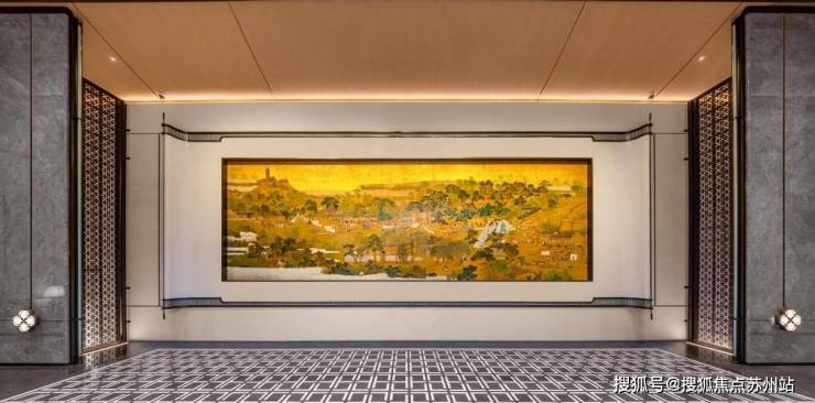 视线随脚步抬升,是中国古建中等级至高的重檐坡顶,凌空出挑。由齐白石曾孙齐驸老师手书的“建发璟园”匾额,大气磅礴;门庭之中,长达8.8米的《姑苏繁华图》非遗漆画盛势铺展,驻足停留间,亦是奔涌不息、辉煌灿烂的文明对话。