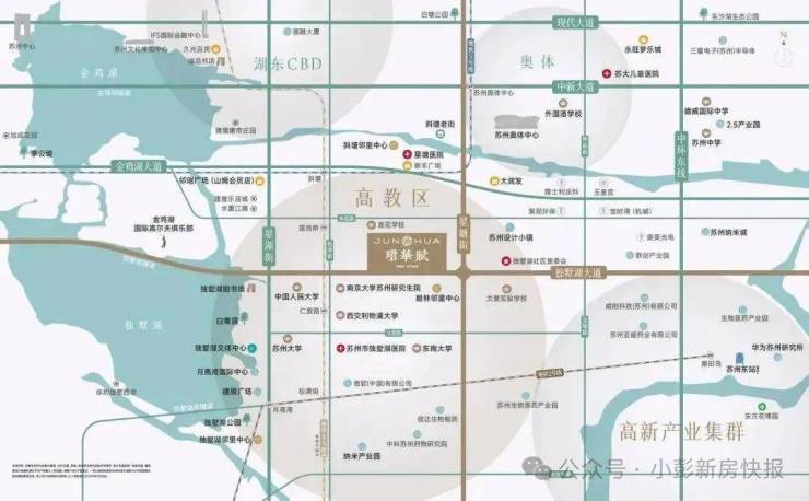 双核交汇:北接湖东CBD(商业/商务核心),南邻独墅湖科创区(33所高校+5000+科企)