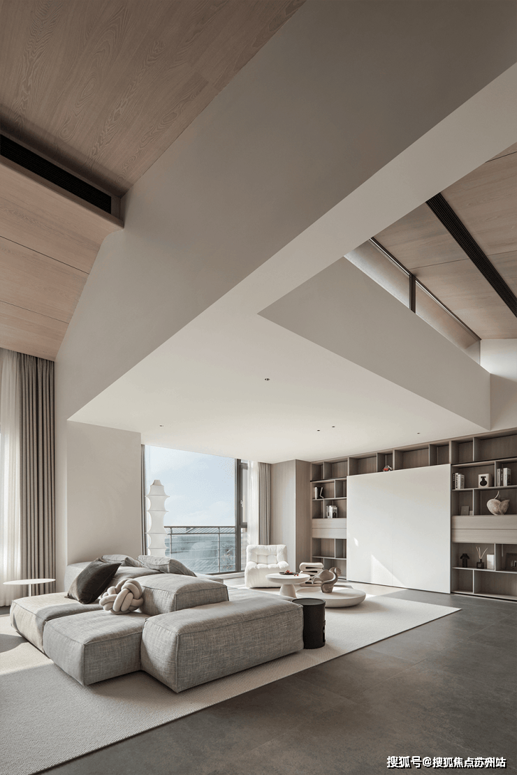 两面式沙发,打造出更随意的坐卧选择与舒适体验。木质吊顶铺展延伸,层次错落有致,仿若将室外的自然意境延伸到了屋内,简雅质朴而温润有加。