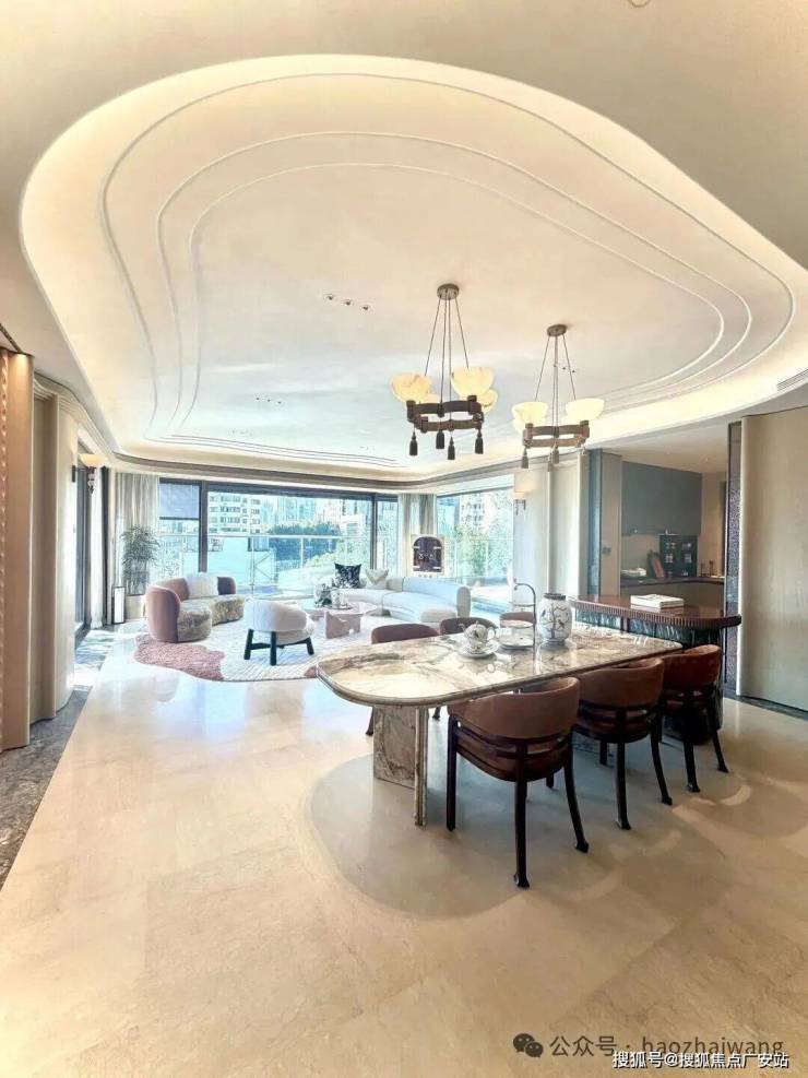 全景舱设计:客厅凸出形成270°环幕视野,采光面长达50米,将江景与城市天际线尽收眼底
