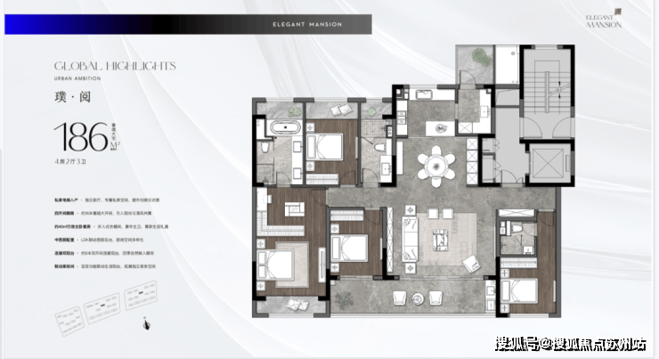 186平:1.约55平LDK厅联动阳台,私家电梯入户,分享式中西双厨空间,独立岛台
