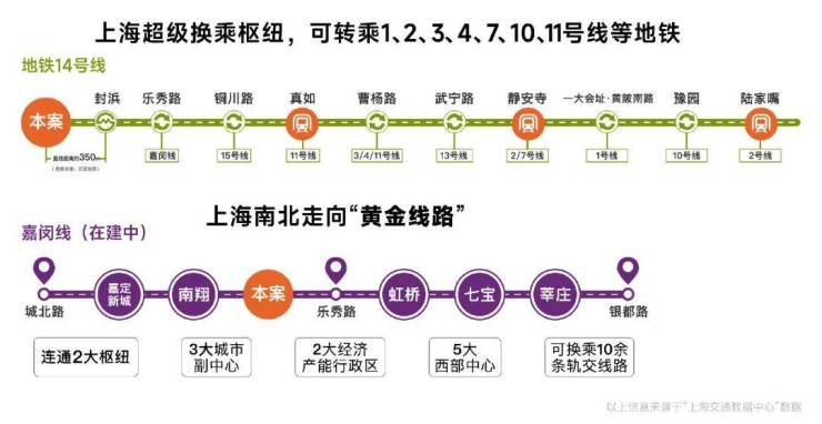 交通能级不断跃升:14号线和嘉闵线(在建中)双轨交汇,直线距离约350米14号线地铁口,14号线为高能级地铁线,5站普陀,直达静安,且始发有座,出行舒适;黄金走廊嘉闵线加速建设,约3站虹桥枢纽,未来可速达七宝、徐家汇、莘庄等核心区域。项目周边开泰路即将建成,绿野谷二期路段、骏达路、童家桥路、昌瑞路、涟澜路已启动建设,预计2026年建成。