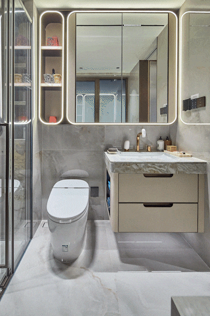 卫生间收纳也是如此,细分护肤、备用、小型清洁、展示用品、常用梳洗五大收纳区,让女主人繁多的物品摆放更井井有条。