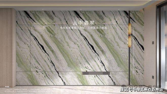 现在开发商都在卷奢材,保利天奕更是卷到天际,是上海首个可定制化背景墙的项目,充分考虑业主的个性化需求,在电视背景板提供了新潘多拉、云中翡翠、弗朗明戈金三种结晶釉面岩板选择,成本更高,施工难度也更大。
