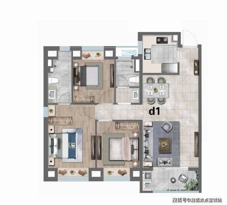 D1户型:建筑面积约113㎡3房2厅2卫