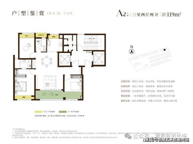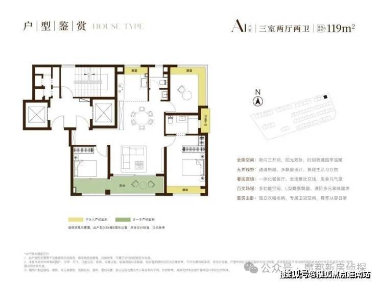 户型结构:主力户型(面积、居室数量)、布局设计(南北通透 / 动静分区)、得房率、赠送面积、飘窗 / 阳台配置