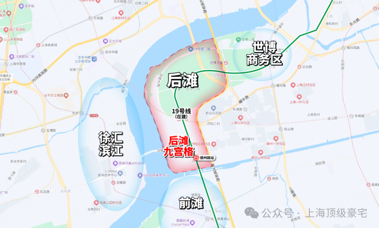 后滩九宫格北接世博文化公园、南邻前滩,西面隔黄浦江就是徐汇滨江,区位非常好,且是黄浦江核心段硕果仅存的滨江住宅区。