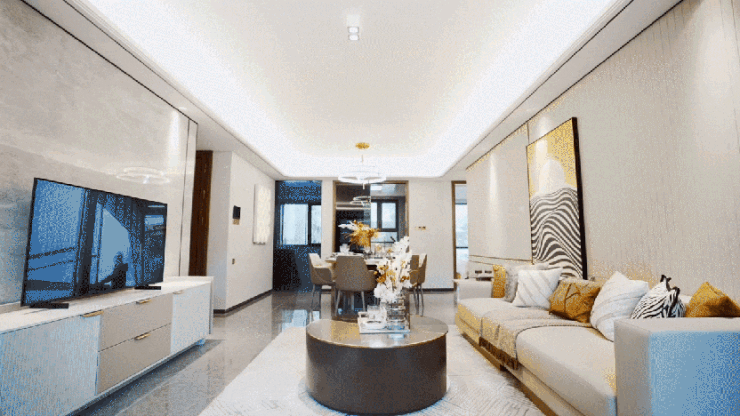 在中骏金辉·未来云城客厅及卧室,梁志天经典造型—三层叠级弧形吊顶装饰天花板,优雅勾勒出高阶生活场域。这项工艺繁复且造价高,耗时为普通吊顶的3倍,常被应用于星级酒店中,足以体现未来云城之用心。