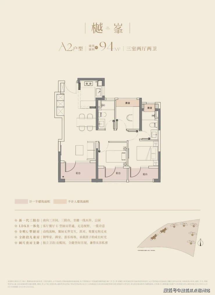 大华望樾的高层建面约94㎡户型做到了三阳台的配置;