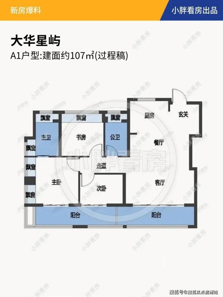 大华星屿建面约107㎡户型南向2个大阳台的合计面积接近16㎡,远超新规标准。如果再算上飘窗附赠以及电梯厅延伸空间,实得率接近100%!