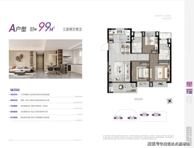 深嘉上府以88-99㎡的明星爆款小户型,圆年轻人的置业梦想。其中,88㎡户型以三房两厅一卫的格局,兼具功能性与尺度感。南向三开间,做到两间卧室朝南,这样的面宽,媲美市面上100㎡户型的新房尺度。u字形的厨房,动线合理。餐厅空间,能够从容摆放一张四人大餐桌。全屋飘窗设计,将赠送空间拉满。