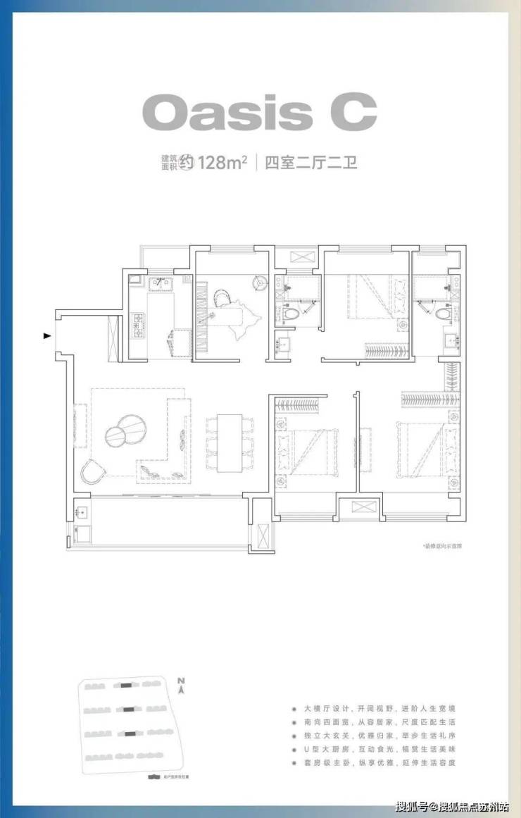 朴注:这个128平户型,只看平面,其实布局比阅泓山晓128平更合理,但是估计窗墙比这些要小很多。另外,阳台比阅泓山晓128差的比较多
