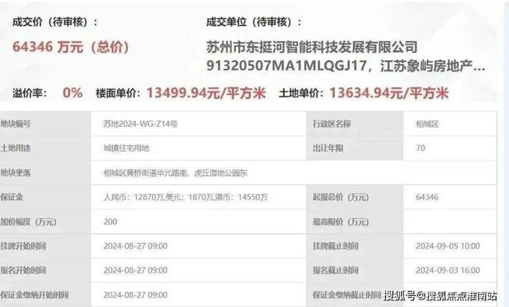 2024年9月5日,苏地2024-WG-Z14号地块成功出让,楼面价约13500元/平方米,地块容积率1.01,出让要求地块住宅户型面积不小于140平方米.