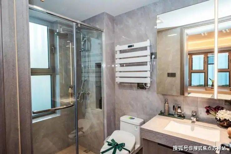 客卫空间,采用科勒的洁具、龙头和花洒,使用定制的浴室柜、镜柜、淋浴隔断,浴室柜台面是人造石,顶部配备了奥普暖风机。主卫空间,除了配备原来客卫的卫浴配置以外,还增添了智能马桶盖、以及奥普加热毛巾架等,细节满满。