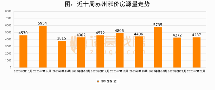 从调价房源来看,第22周苏州涨价房源4287套,较上周上涨0.4%。与此同时,22周涨价房源占比回落0.22个百分点,业主信心小幅波动,购房者可则需入市。